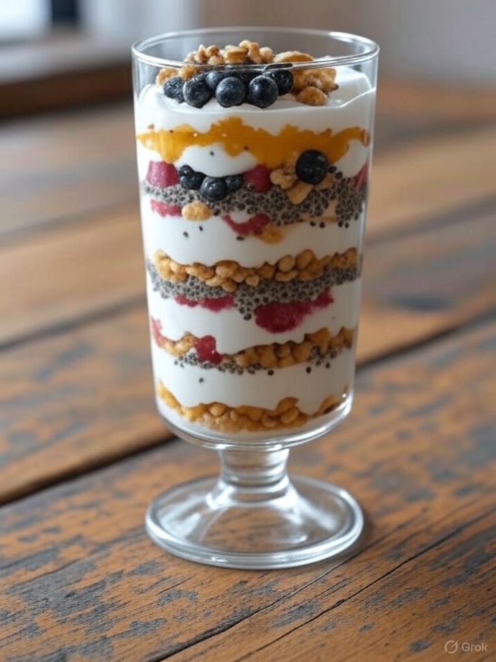 - Instructions: Layer yogurt in a glass, drizzle honey, add berries, walnuts, and chia seeds.
