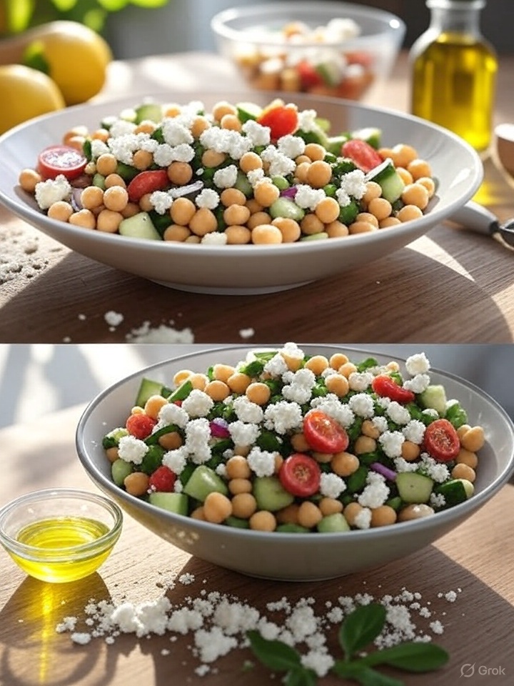 - Instructions: Mix chickpeas, cucumber, tomatoes, onion, and feta. Whisk oil, lemon juice, and oregano; toss with salad.