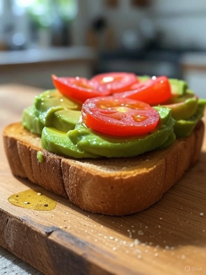 - Instructions: Toast bread, mash avocado, spread on toast, add tomato, drizzle oil, and sprinkle salt.